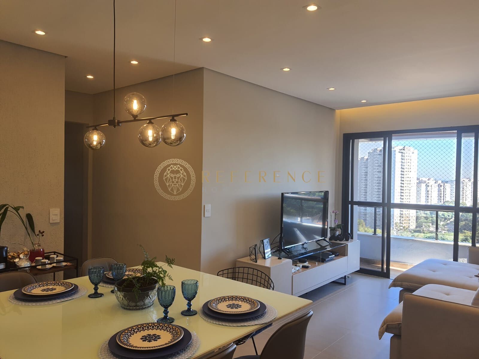 O living integra sala de TV e sala de jantar, criando ambientes amplos para convívio familiar e recepção de convidados.