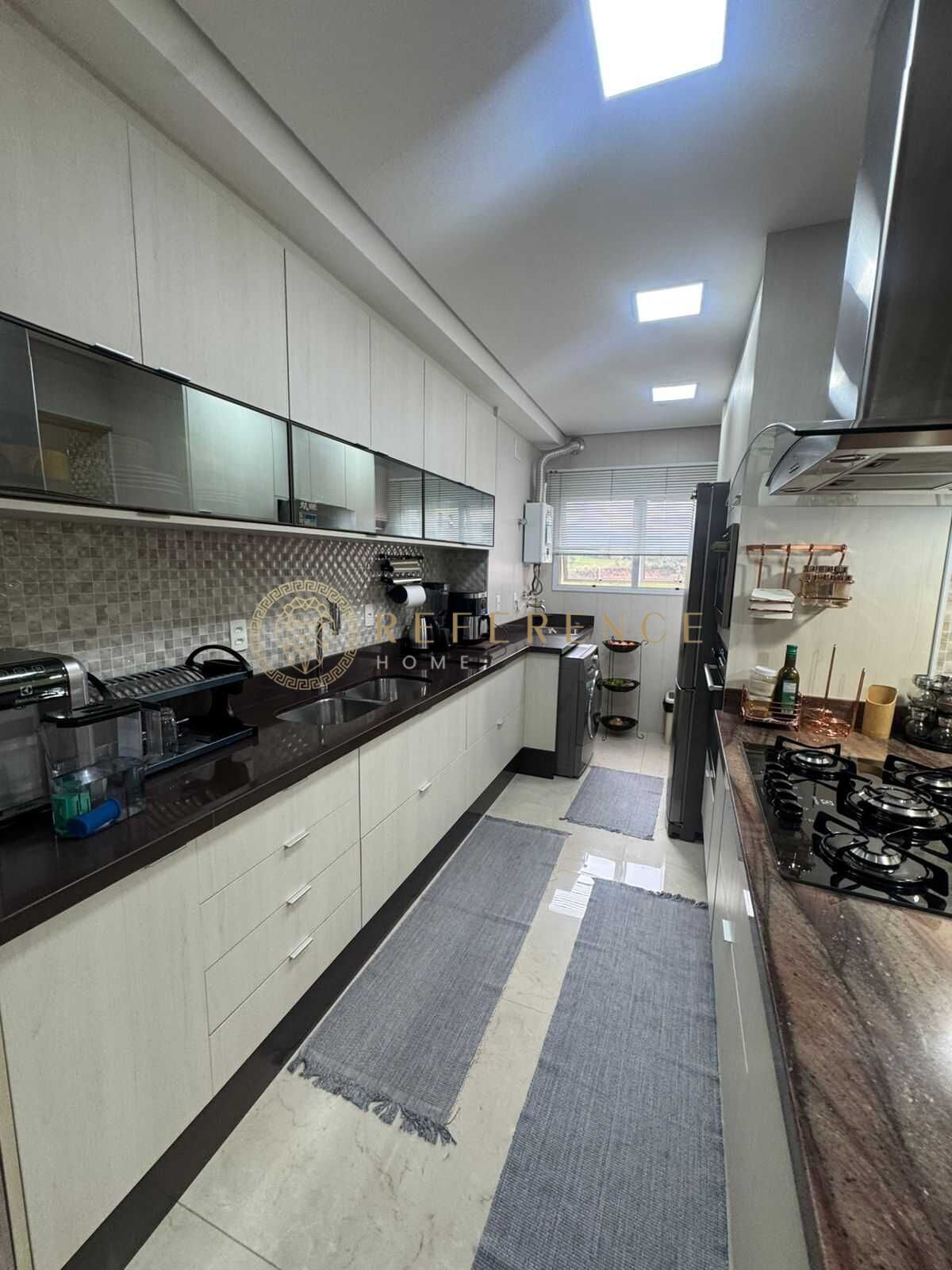 Inteiramente planejada, equipada com forno e cooktop, a cozinha traduz praticidade e elegância, mantendo-se funcional e convidativa ao mesmo tempo.