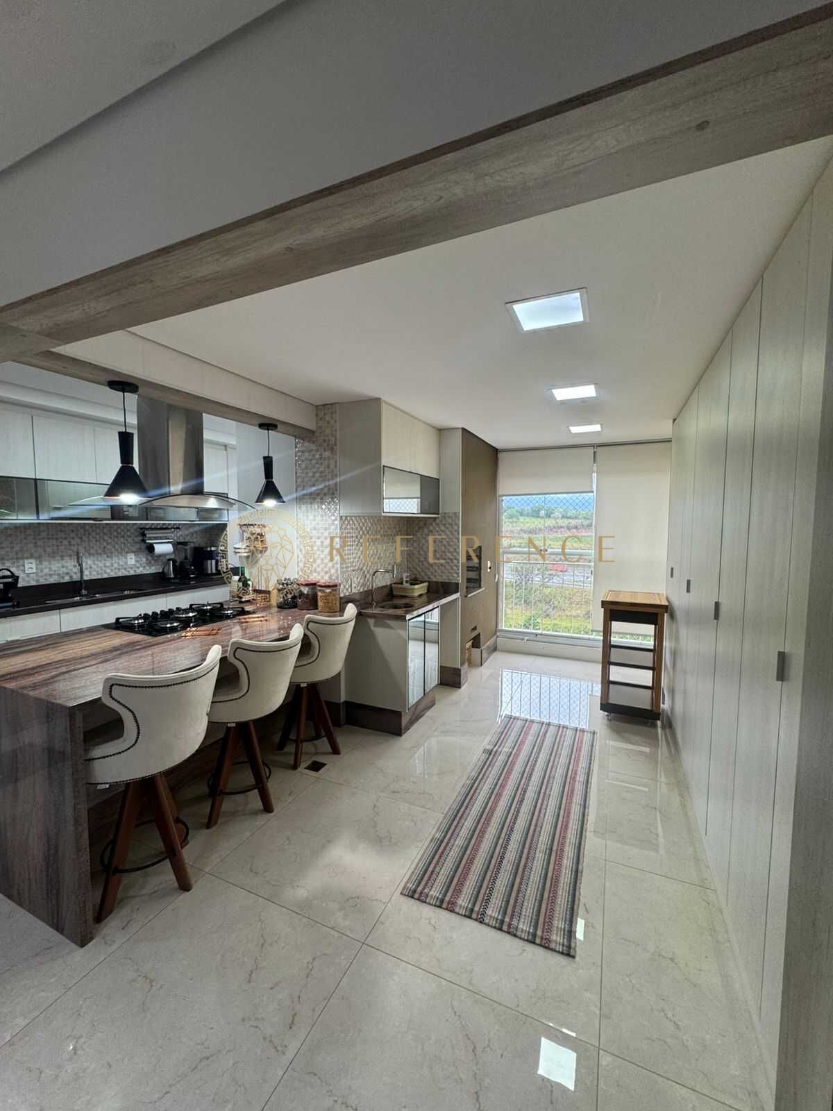 A ambientação contemporânea e os móveis planejados reforçam a sensação de ordem e sofisticação, enquanto a varanda gourmet — integrada à área social — oferece um refúgio perfeito para receber, relaxar e apreciar a vista com privacidade.