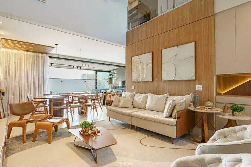 O hall de entrada imponente conduz à sala de estar integrada à sala de jantar, criando um espaço acolhedor e sofisticado, ideal para convivência familiar ou recepção de convidados.