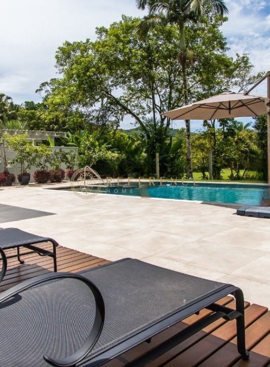 A residência oferece piscina com spa, deck em madeira, varandas e áreas externas planejadas, integrando convívio social e paisagismo autoral.