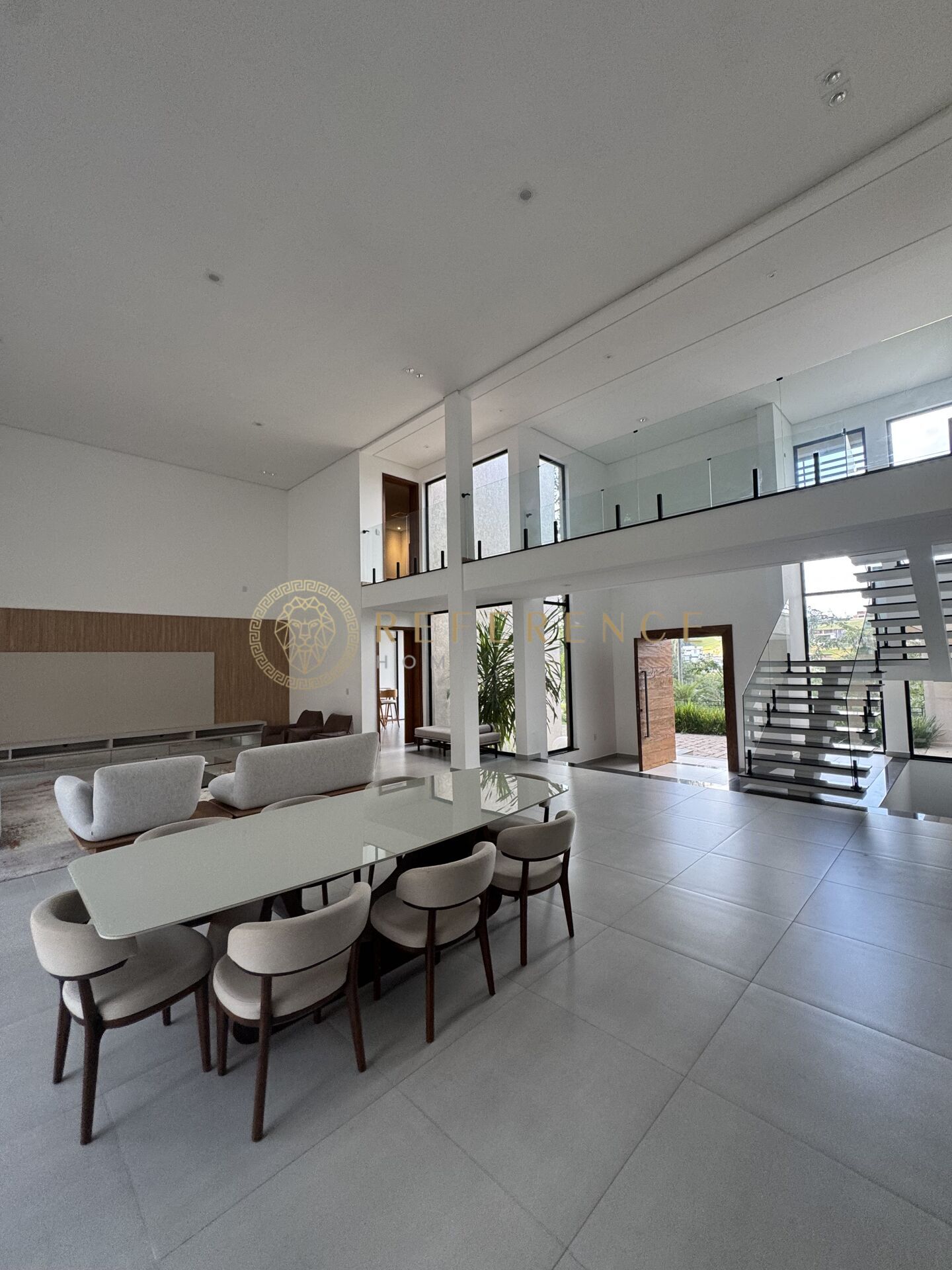 O living integrado com sala para três ambientes e pé direito duplo cria uma atmosfera de amplitude e elegância.