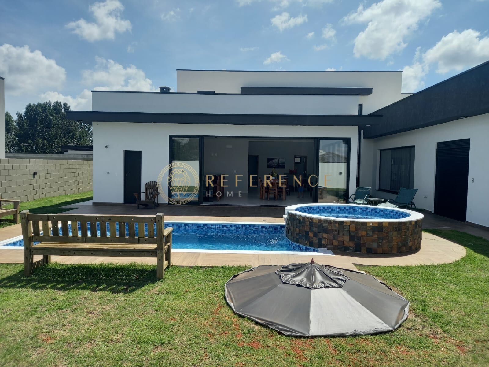 1.000 m² de terreno | 340 m² construídos | 03 suítes, sendo 1 master | salas amplas com pé direito alto | escritório | piscina com hidromassagem | 04 vagas de garagem