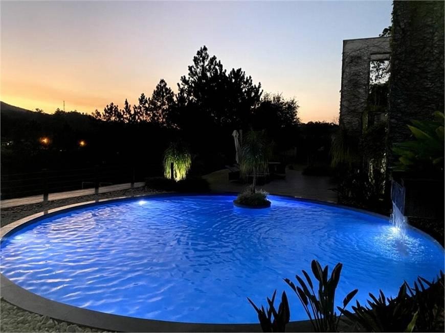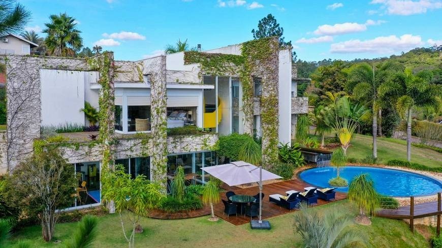 5.050 m² de terreno | 900 m² construídos | projeto do Arquiteto Roberto Pace | 3 suítes + residência auxiliar | piscina, campo de futebol e pomar | condomínio fechado com segurança e privacidade
