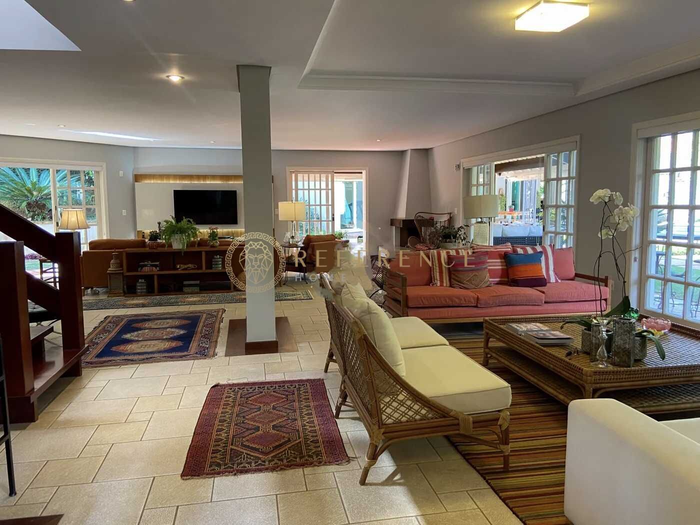 Living amplo e sofisticado, composto por quatro ambientes bem definidos — estar, jantar, TV e lareira — criando diferentes cenários para convivência e relaxamento.