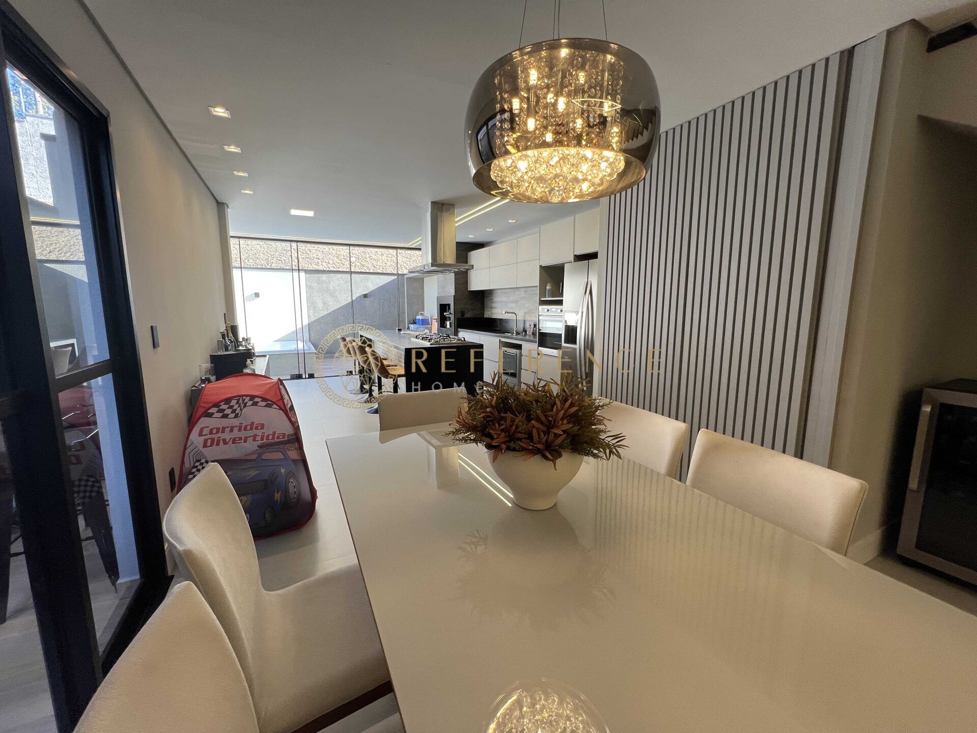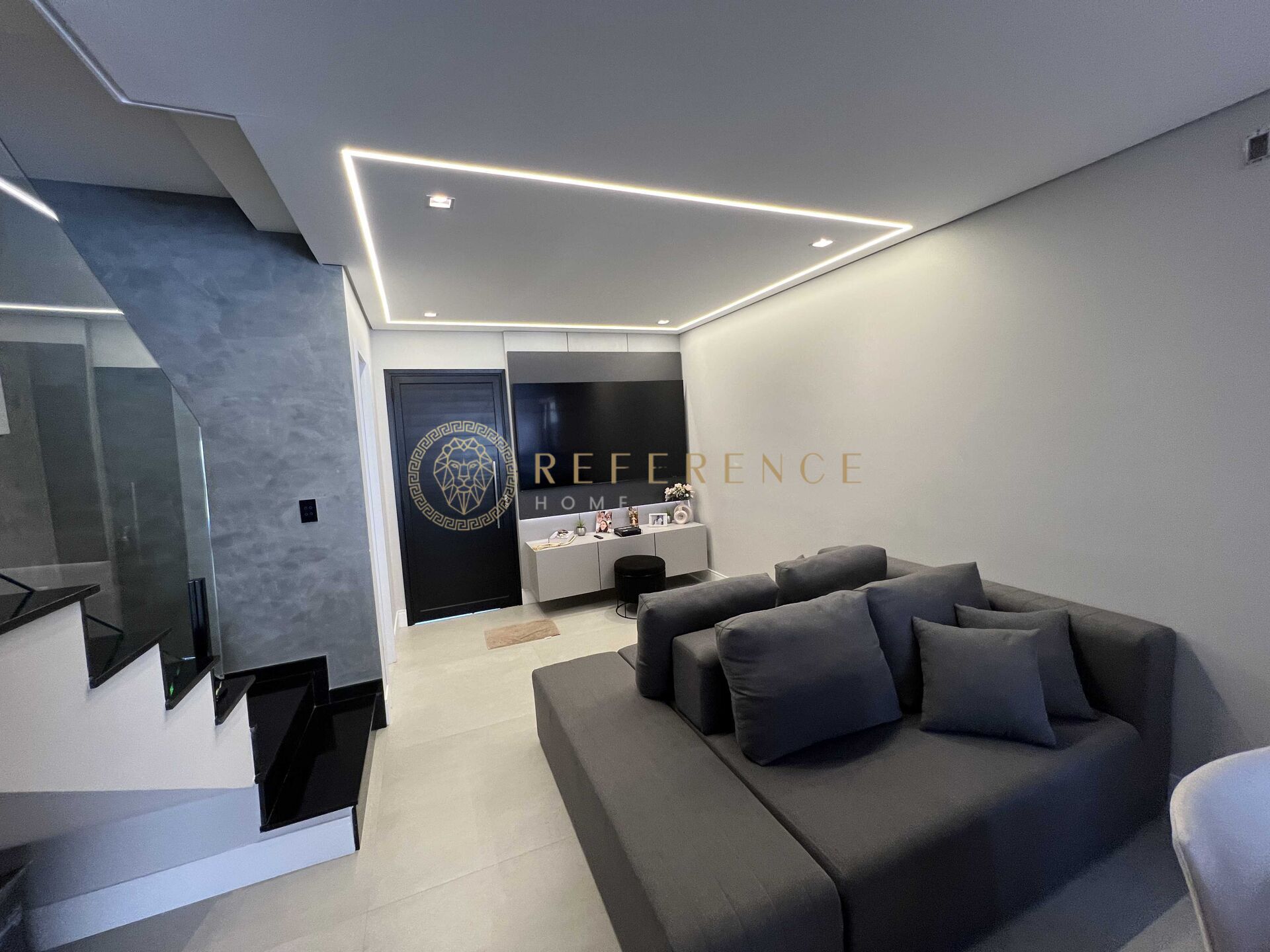 Ao atravessar a porta principal da casa, você é recebido por um living espaçoso e arejado, onde a iluminação natural se combina com o projeto de luz em LED, criando uma atmosfera acolhedora e elegante.