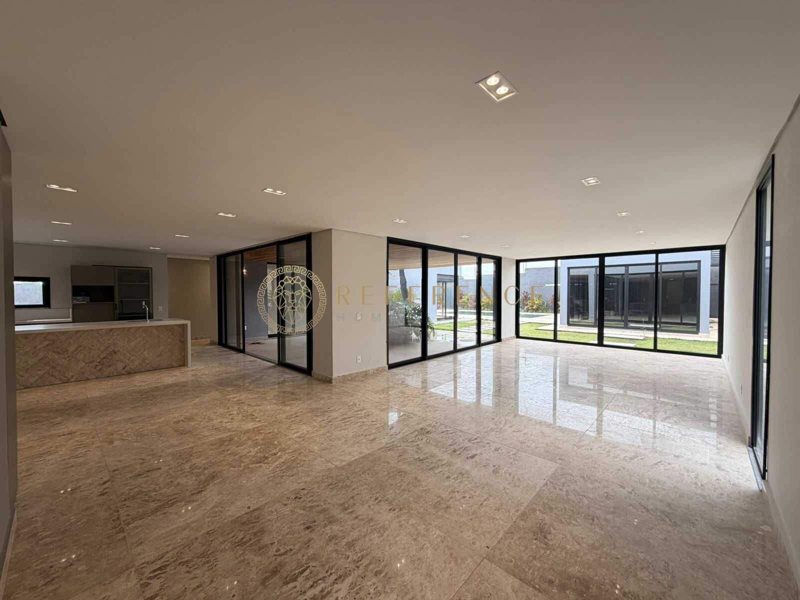 Ambiente amplo e bem distribuído, com grandes aberturas em vidro que favorecem a entrada de luz natural e a conexão visual com o jardim e a área externa.