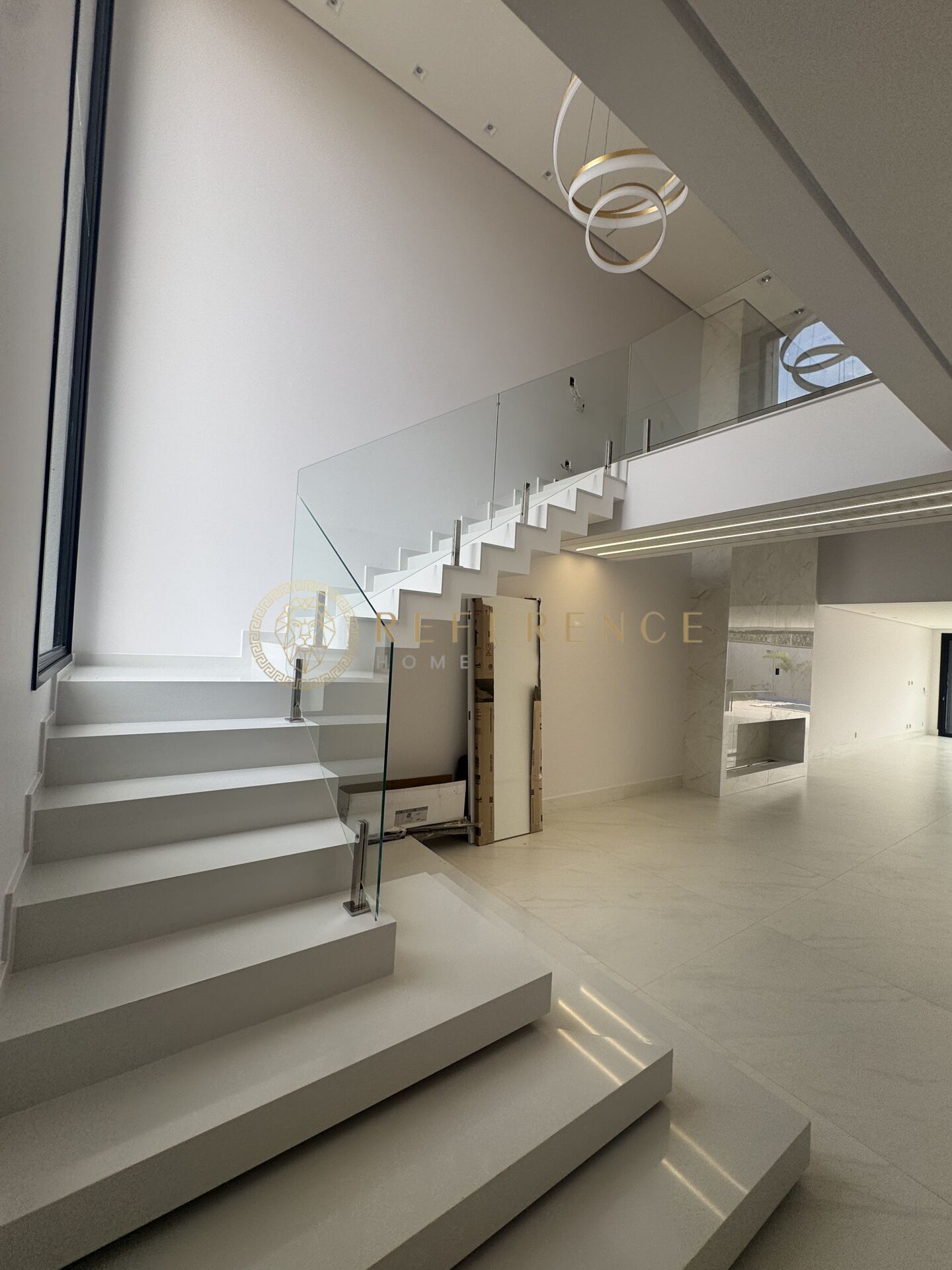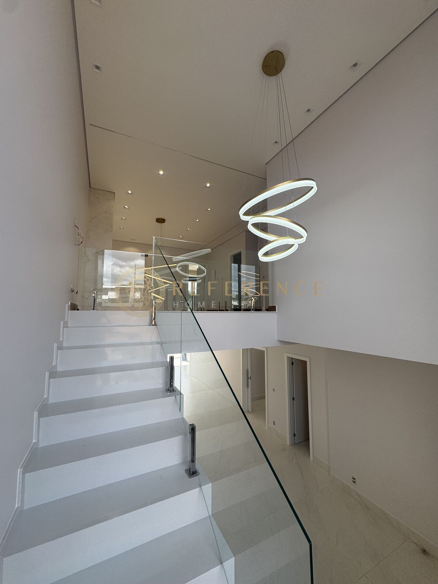 Casa sobrado de alto padrão com 3 suítes, automação, lareira ecológica, piscina com aquecimento preparado e área gourmet integrada.