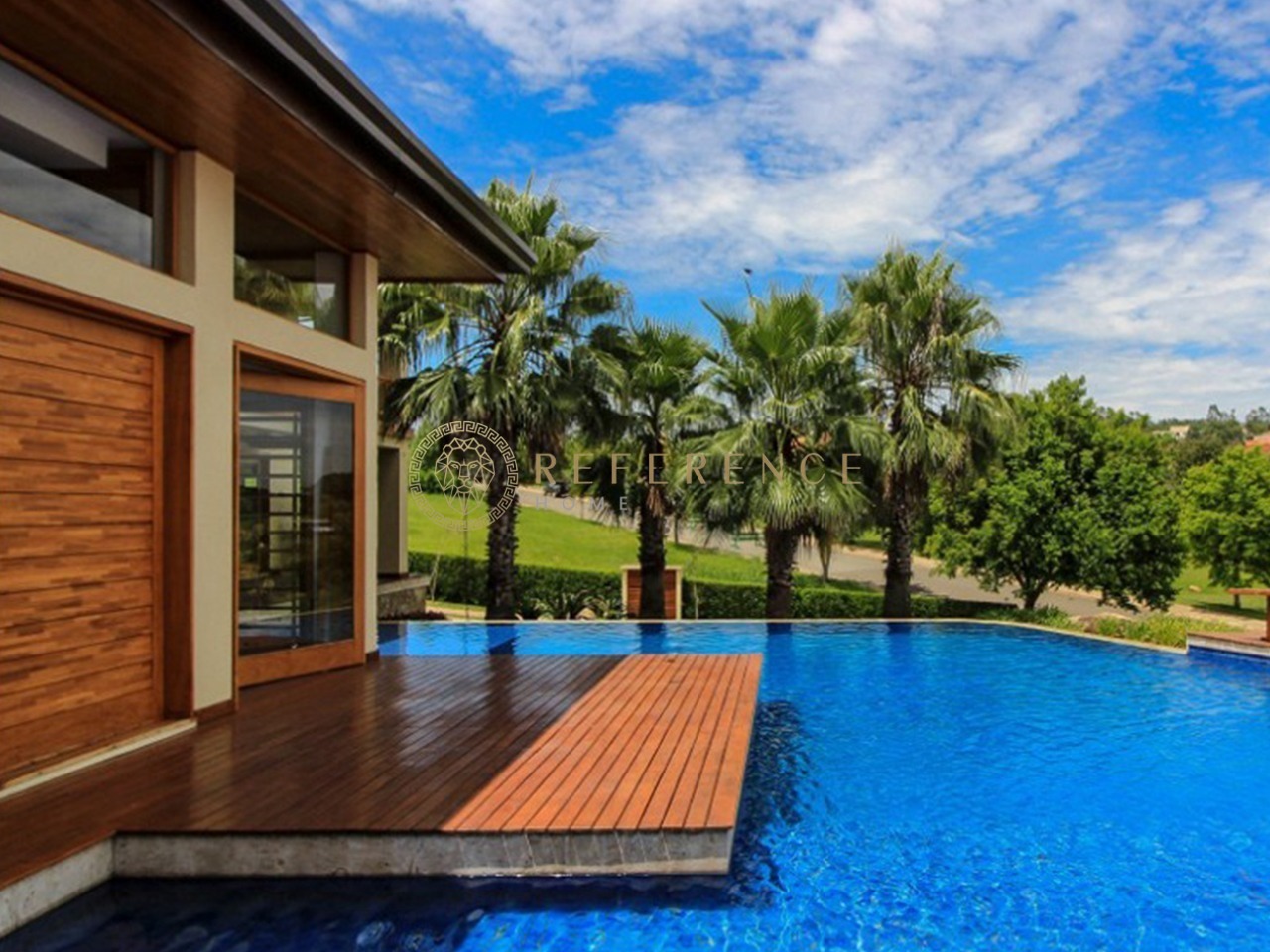 Desde a chegada, o imóvel revela seu caráter sofisticado, com paisagismo impecável, espelho d’água e uma conexão visual direta com o campo de golfe.
